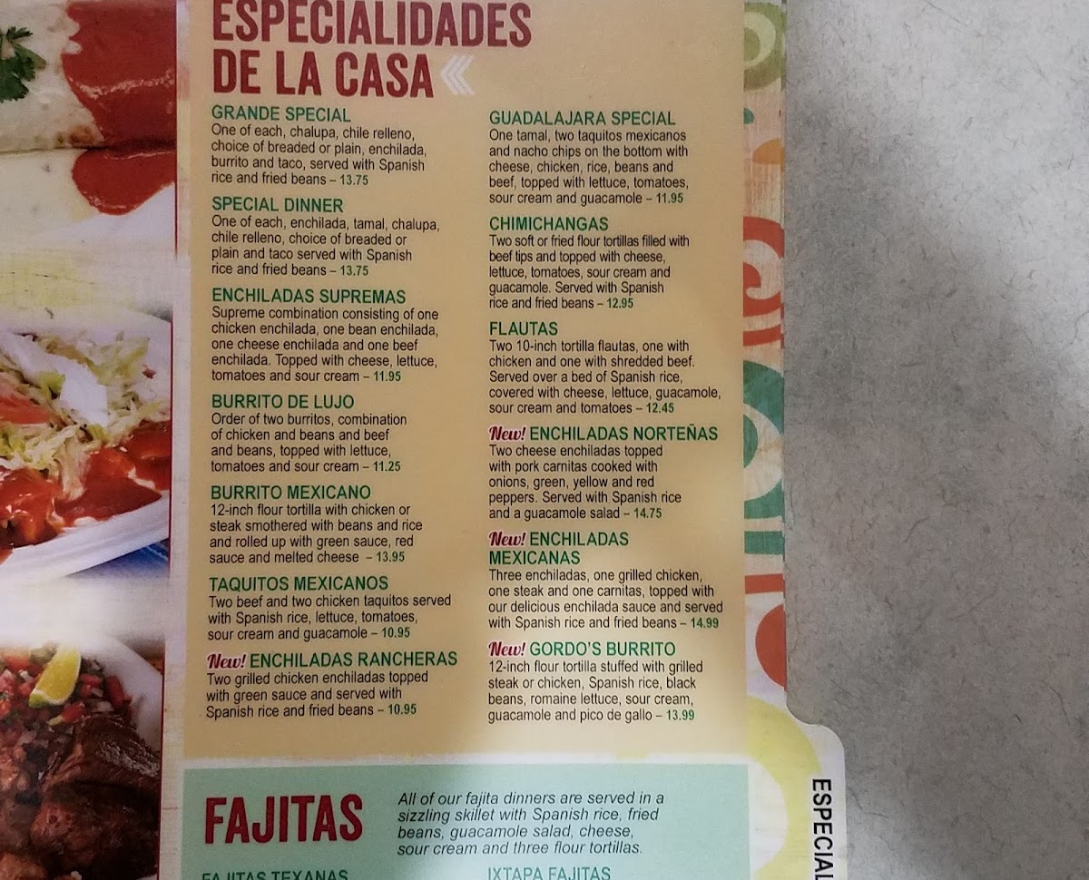 Tender-sliced steak or chicken grilled with red, green and yellow peppers, onions and tomatoes. Served with Spanish rice, fried beans, lettuce, tomatoes, sour cream, grated cheese and two flour tortillas